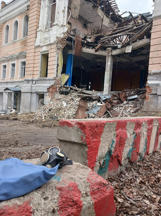 This poetic mural on the side of a bombed out building in Kupians’k captures the hopeful and enduring spirit of the Ukrainian fighters on this frontline city. The Russians are opposite the town, across the Oskeii River, shelling the defenders, and what remains of the town. The Institute of War has an interactive map, updated daily, that shows the active frontline (https://isw.pub/InteractiveUkraineWarMap). Kupians’k is the furthest reach of the Russians on the northern arena of the conflict. A visit to the town included a short stop in Shenchenkove, a small village that had a string of cafes and shops, and a Nova Poshta, and some outlying homes. The Nova Poshta was very busy, with a line of soldiers opening newly received packages in the dirt lot to disperse to the right recipients. A small cafe with 10 tables for indoor seating served fresh pizzas, stuffed pastries, and meals like Olivya Salad, fried chicken, cooked sausage, and the likes. Soldiers huddled around tables and walk-up windows in groups of 4-5, drinking coffee and chatting. We approached one of them and asked–via a translate app–if the road to Kupians’k was open.